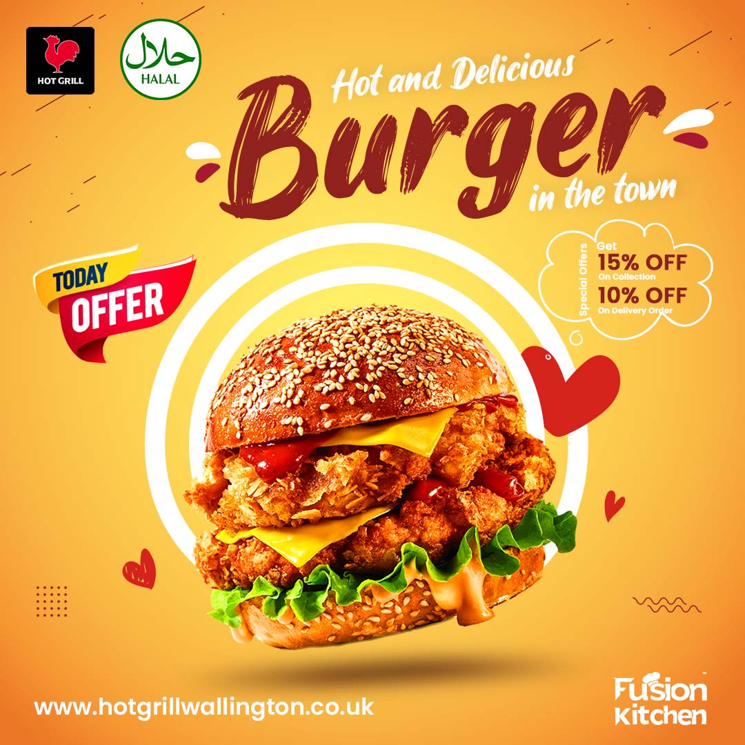 Grilled burger with a fries and a drink you can choose the flavour of Medium,Hot,Extra Hot,Mango &Lime,Lemon & herb